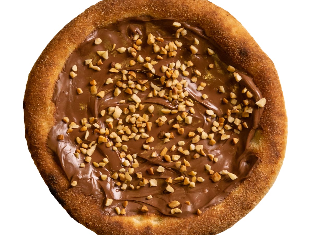 Mini Pizza (15 cm) de Nutella com Castanhas: massa de pizza artesanal, muuuita Nutella e castanhas trituradas.