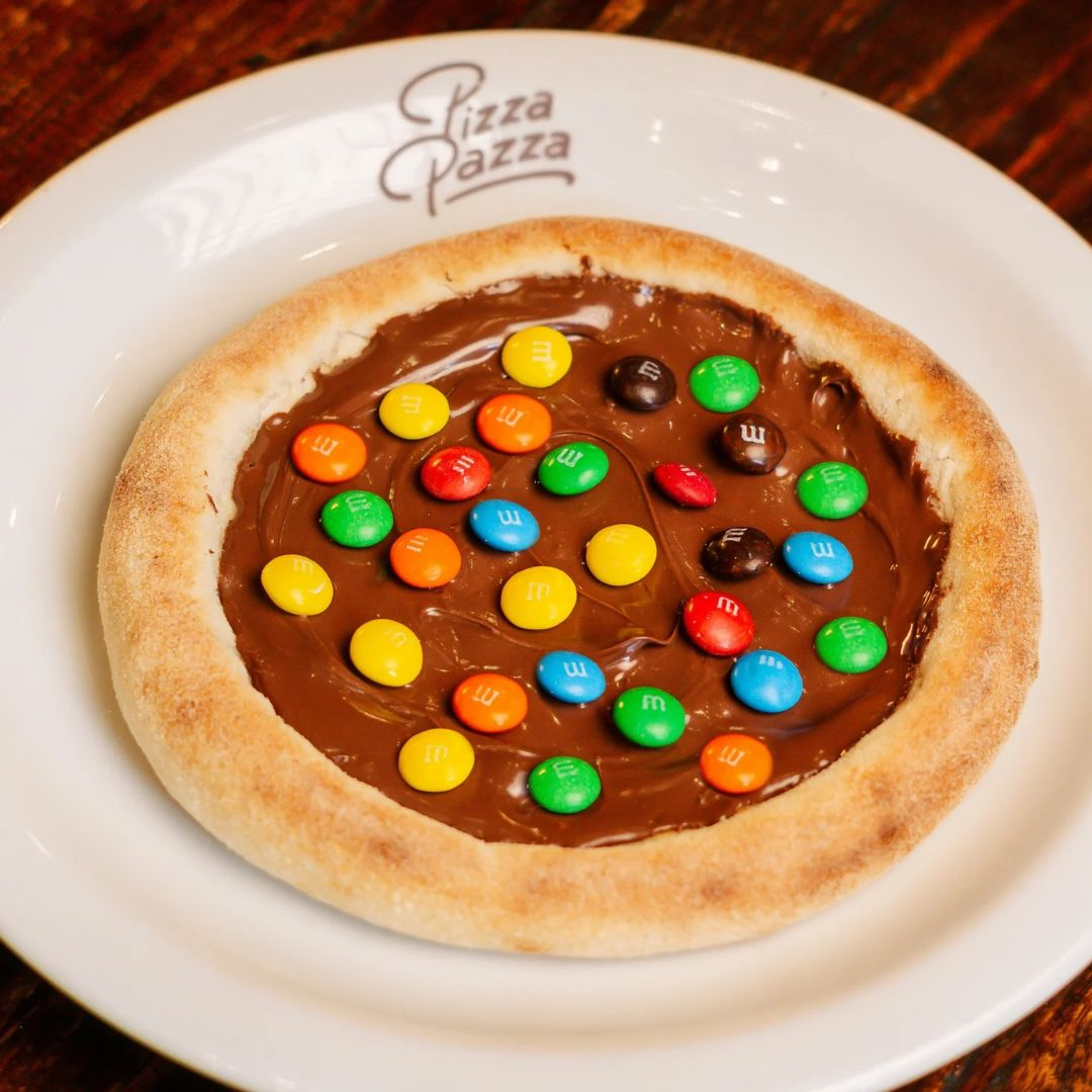 Mini Pizza (15 cm) de Nutella com M&M's: massa de pizza artesanal, muuuita Nutella e M&M's