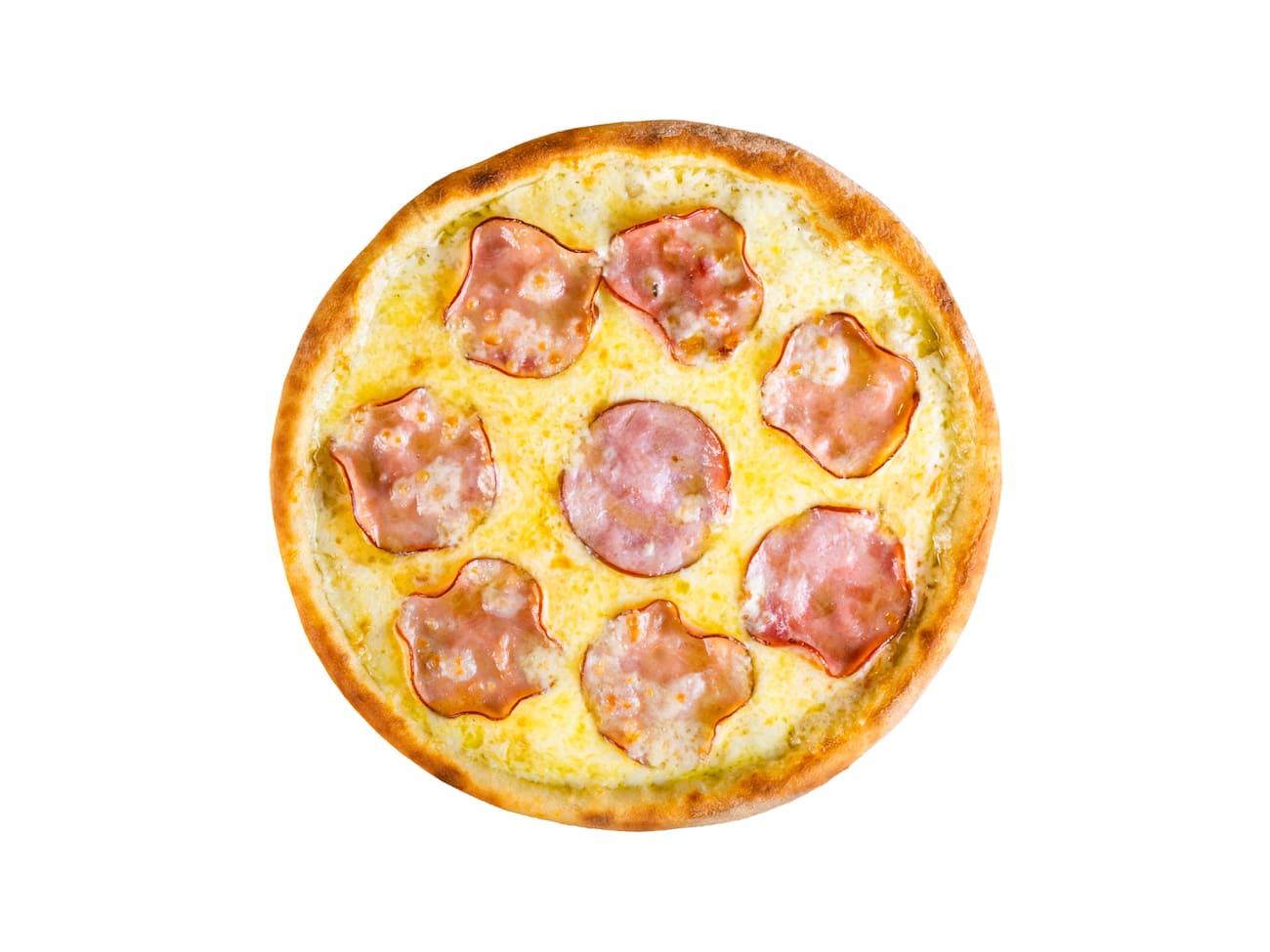 Molho de tomate artesanal, mussarela e presunto. Escolha o tamanho da sua pizza: pizza Brotinho, pizza Média, pizza Grande ou pizza Gigante.