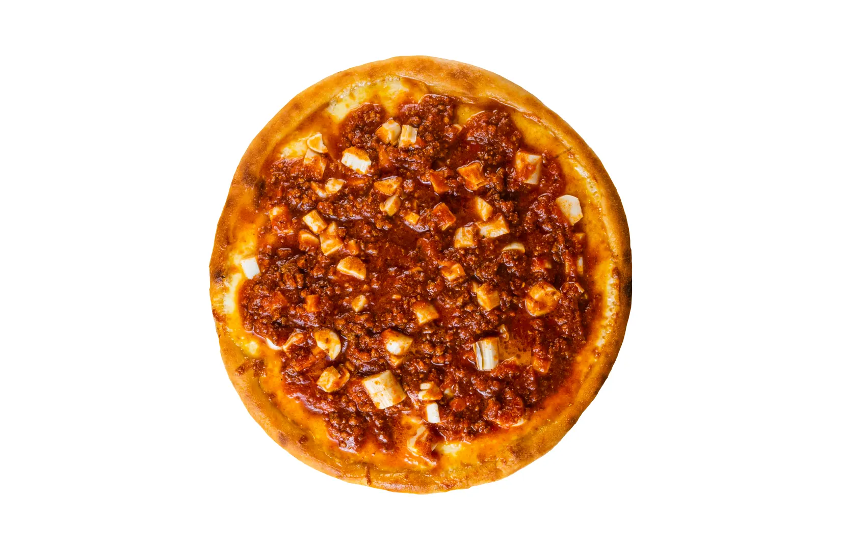 Molho de tomate, mussarela, frango desfiado e molho à bolonhesa. Escolha o tamanho da sua pizza: pizza Brotinho, pizza Média, pizza Grande ou pizza Gigante.