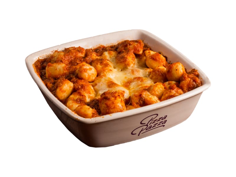 Nhoque artesanal de batata, molho bolonhesa e mussarela para gratinar