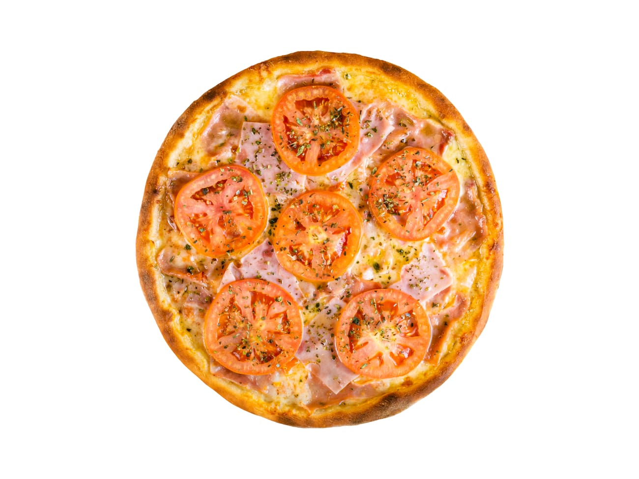 Molho de tomate artesanal, mussarela, presunto, tomate e orégano. Escolha o tamanho da sua pizza: pizza Brotinho, pizza Média, pizza Grande ou pizza Gigante.